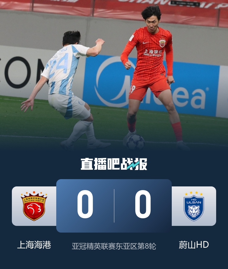 全场角逐停止,上海海港0-0蔚山HD。8轮角逐当时,上海海港4平4负积4分排在东亚区第12名,蔚山HD积9分排在第9名。↓