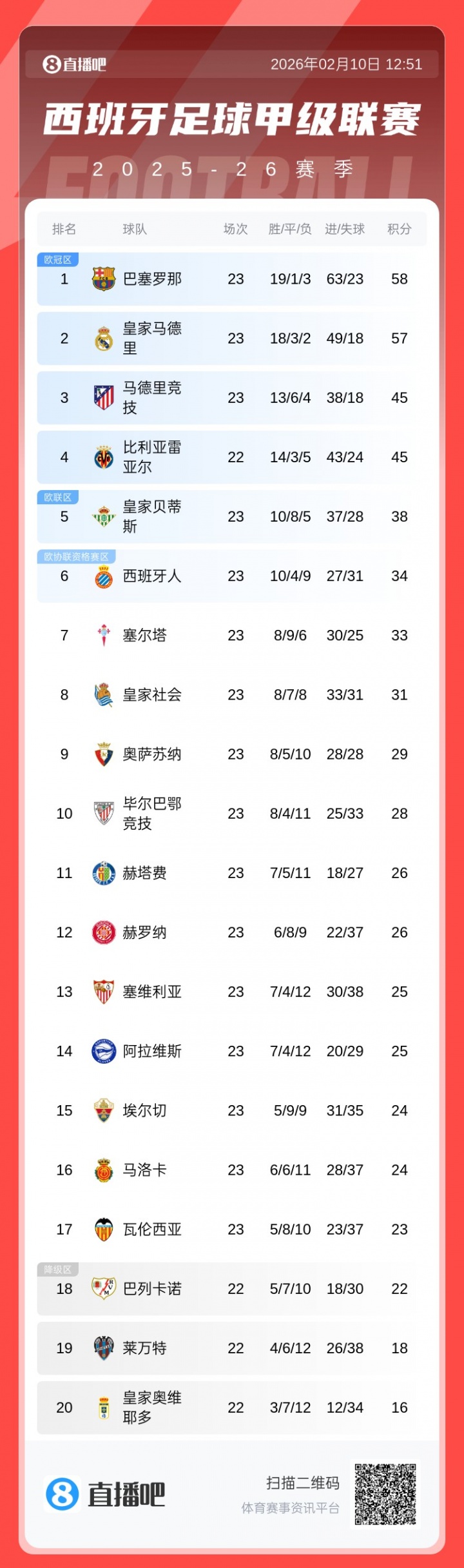 23轮后,西甲的积分榜各个阶段分别异常明白。三四名马竞跟比利亚雷亚尔同分(黄潜少赛1场),他俩断层唯一档。直播吧02月10日讯 西头等23轮,除了展期的角逐未战,本轮其余赛事所有战罢