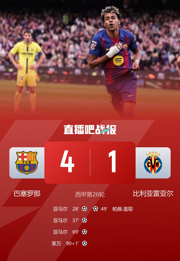 先赛4分领跑!巴萨4-1比利亚雷亚尔 亚马尔生活首戴帽莱万立门
