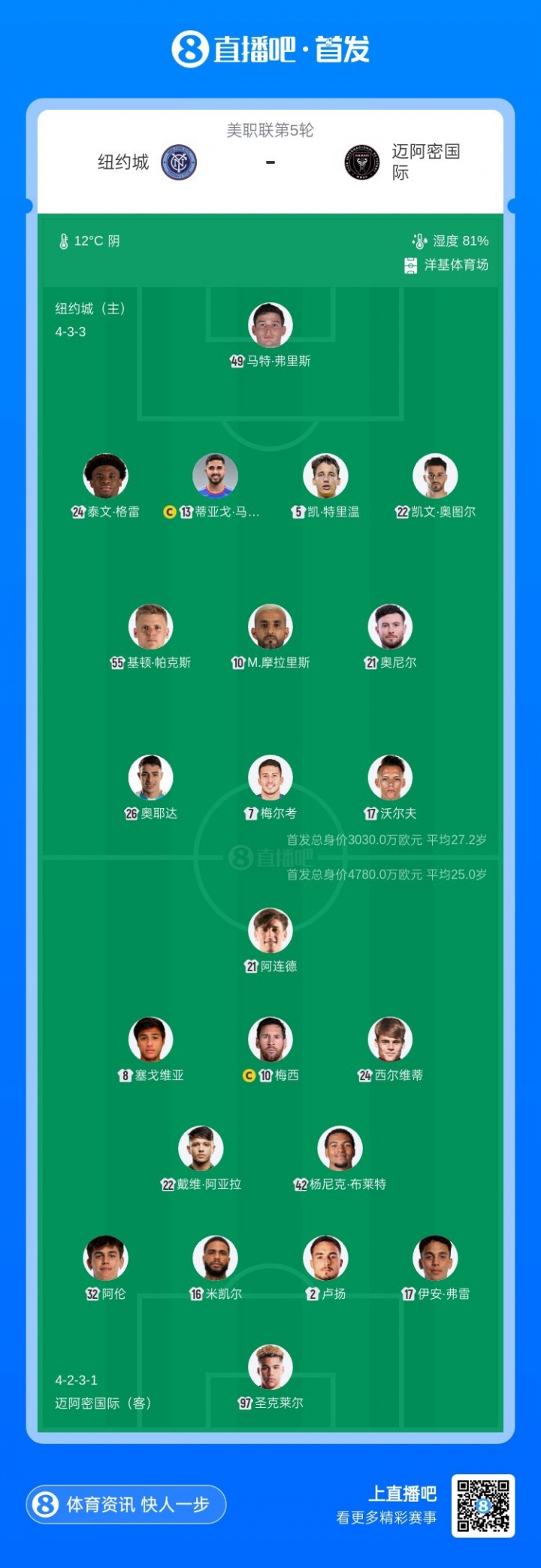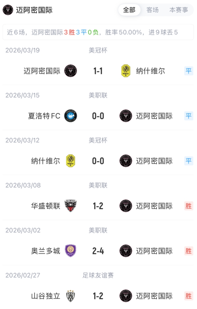 迈阿密国外首发:97-圣克莱尔、32-阿伦、16-米凯尔·多斯·桑托斯、2-卢扬、17-伊安·弗雷、22-阿亚拉、42-布莱特、8-塞戈维亚、24-西尔维蒂、10-梅西、21-阿连德迈阿密国外替补:34-诺沃、41-鲁伊斯、76-阿巴迪亚·雷达、20-圣地亚哥·莫拉莱斯、19-贝尔特拉梅、9-苏亚雷斯、56-平特、88-亚历山年夜·肖、4-穆拉