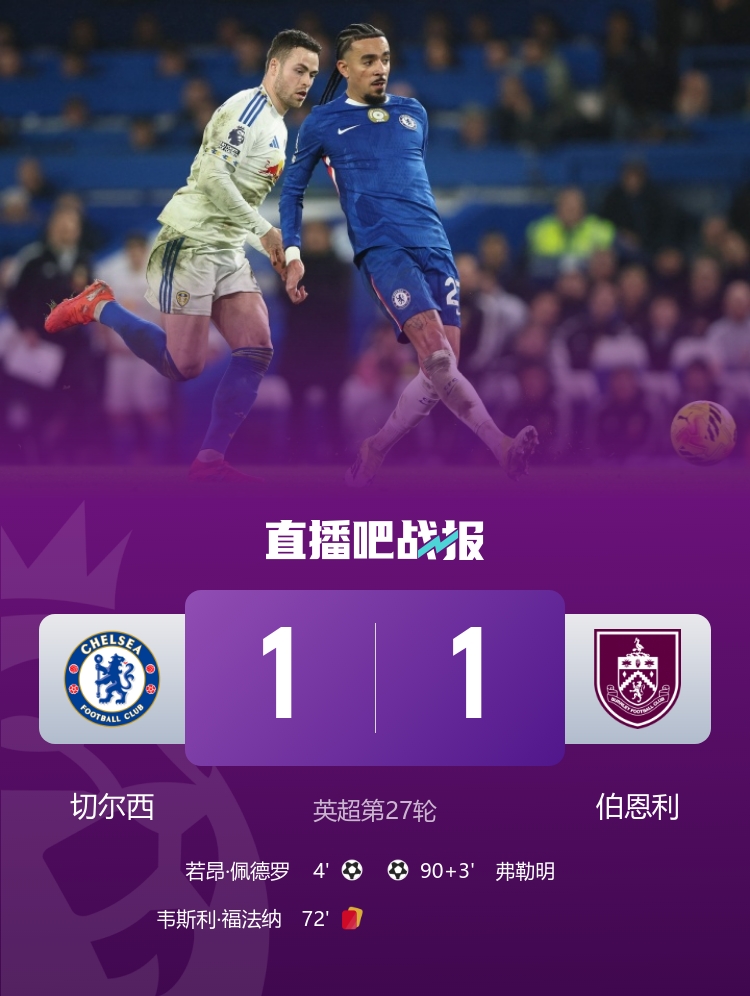 上半场,内乱托助攻若昂-佩德罗立门为切尔西首户口记录,汉尼拔、福法纳犯规吃到黄牌,帕尔默错掉单刀!半场战罢,切尔西暂1-0伯恩利;下半场,福法纳犯规吃到小我私家本场第二张黄牌,两黄变一红被罚下,弗勒明补时进球扳平。↓ 弗勒明立门进球回阁阁↓【角逐核心倏得】