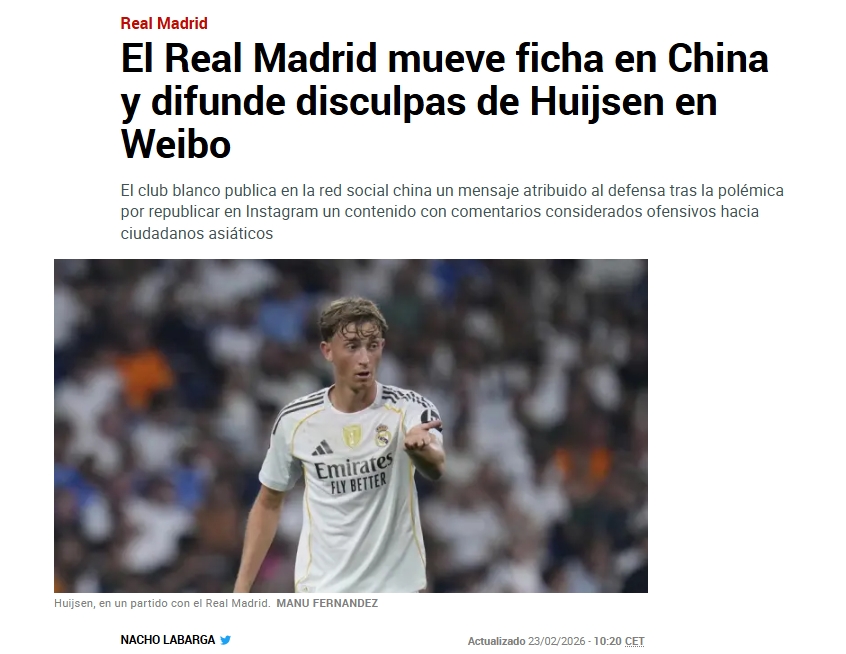 各年夜西媒报讲读赫伊森事宜:菲薄抱歉遭批,皇马球迷曾唱轻视性歌曲